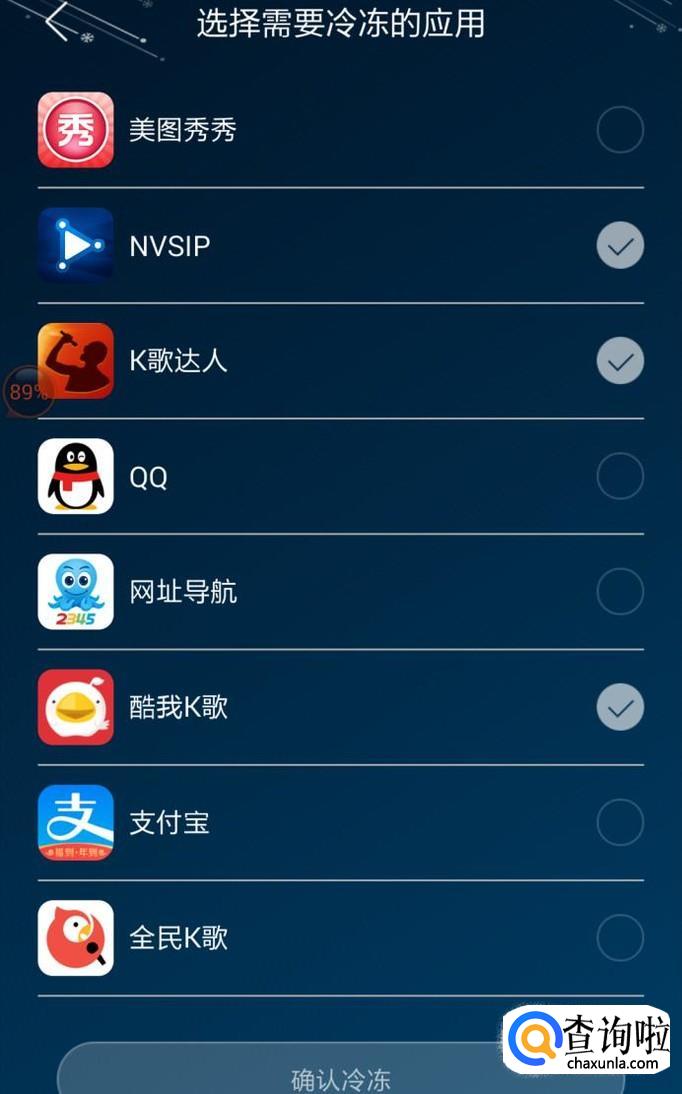 在出现的列表里选择要冷冻的软件,点下面的“确认冷冻”。