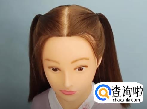 首先我们将头发分成前后两部分,并将前部分的头发分成左右各一半,然后用皮筋扎起来。