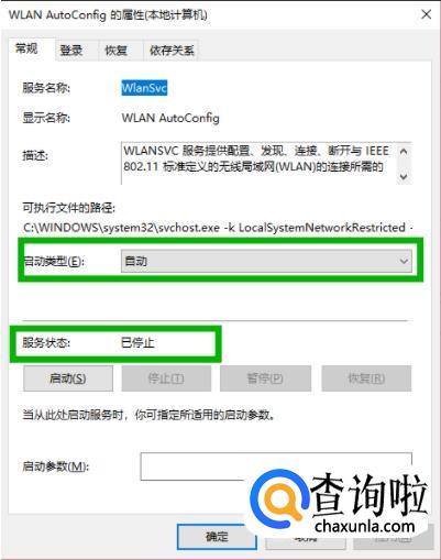 在打开的【服务】列表,找到【WLAN AutoConfig】服务,然后双击打开属性窗口,我们可以确定【启动类型】为【自动】,【服务状态】为【已停止】,点击【启动】无法启动