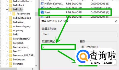 继续在右侧双击【start】项(没有同样可以新建DWORD值),将【数值数据】修改为【2】然后点击【确定】,然后按F5刷新