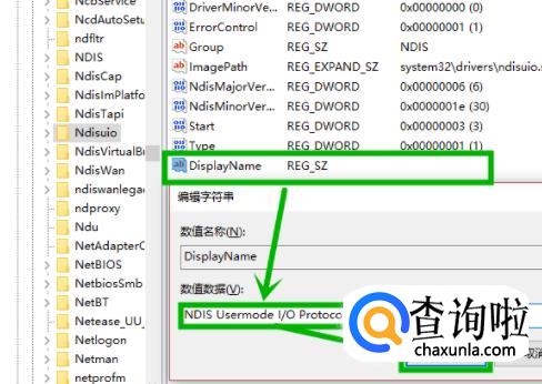 右击空白处,选择【新建】>>【字符串值】,然后重命名为“DisplayName”,双击打开【编辑字符串】界面,在【数值数据】处输入“NDIS Usermode I/O Protocol”后点击【确定】
