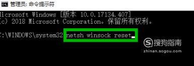 在打开的【管理员:命令提示符】界面,输入“netsh winsock reset”后回车,重启电脑就行了