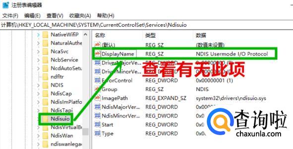 我们再次打开【运行】窗口,输入“regedit”后打开【注册表编辑器】窗口,然后定位到:计算机HKEY_LOCAL_MACHINESYSTEMCurrentControlSetServicesNdisuio,在右侧查看是否有【DisplayName】,数据为【NDIS Usermode I/O Protocol】的项(如图),没有需要新建,往下看