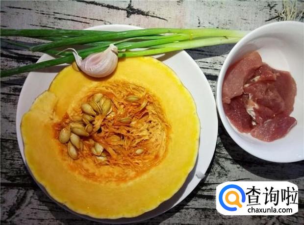 准备好所有原材料:南瓜适量、瘦肉适量、香葱两根、蒜头两瓣。