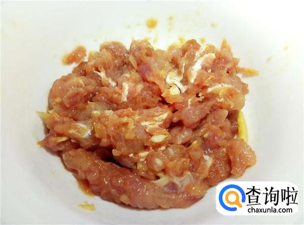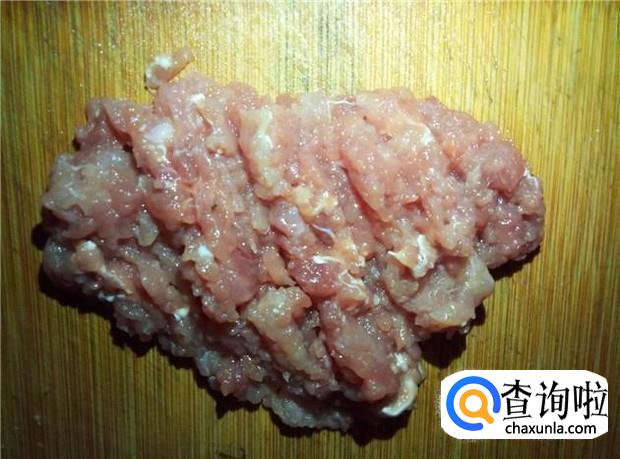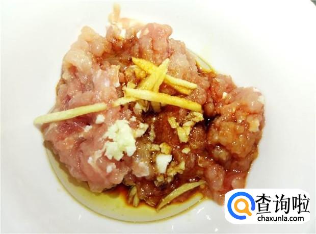 瘦肉用刀子剁碎,加入适量的蒜头、姜丝、花生油、酱油、盐、淀粉,搅拌均匀,腌制一会。
