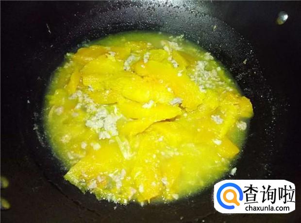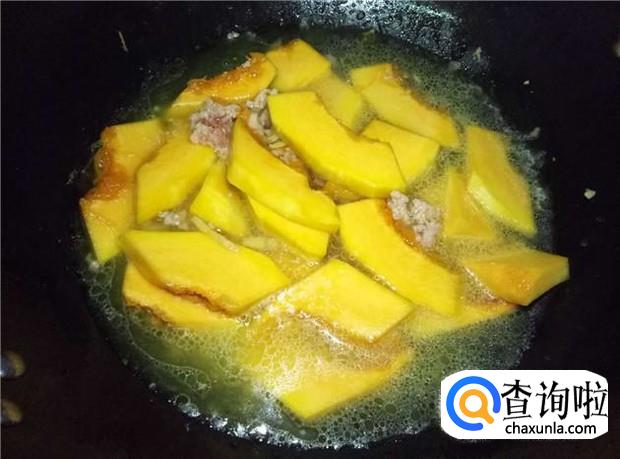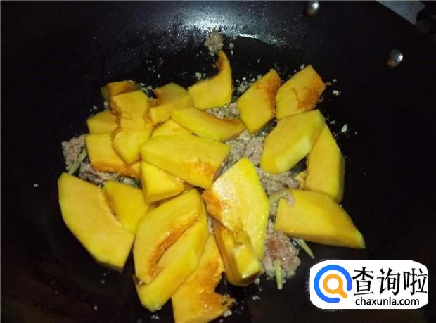 肉沫变颜色后,倒入南瓜,加入适量的盐,翻炒均匀南瓜和肉沫;