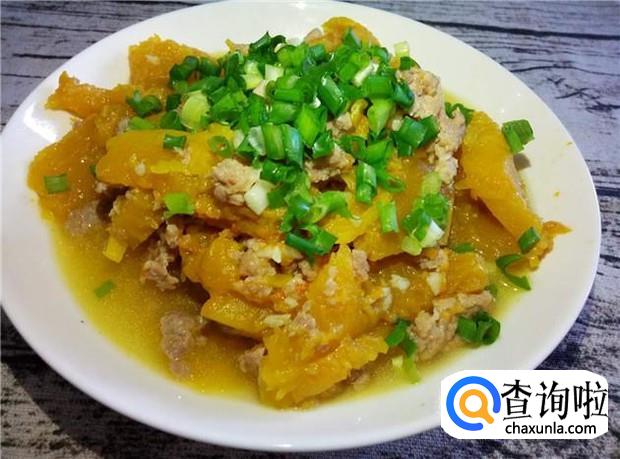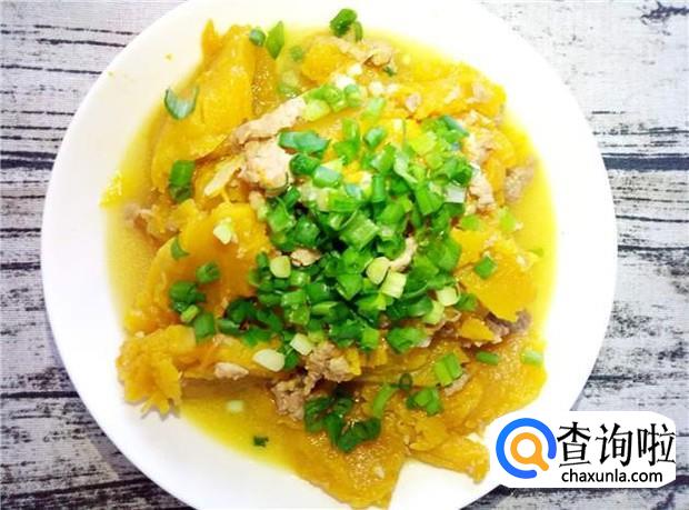 焖熟的装盆,撒上葱花,即可享受美味香甜的肉沫南瓜了。