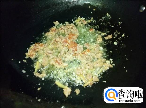 然后把腌制好的肉沫倒下去,翻炒均匀。