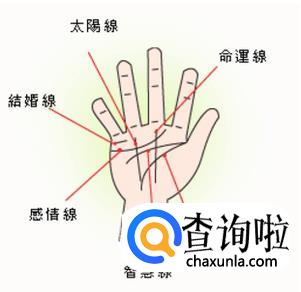手相基本上是由六条线所构成的:生命线代表你的体质、健康状态或寿命;智慧线代表你的才能、智力、生活能力、直觉力等;事业线代表你的运势强弱,以及将来的线;太阳线表示你的幸福度、社会地位的提升、成功运和财运;婚姻线表示你的恋爱运。一般说来左手代表先天的运势,右手代表后天的运势。