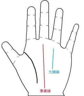 和命运线一样,从下而上年龄不断递增,太阳线与智慧线的交点是35岁,与感情线的交点是50岁,到达食指根部是90岁。成功线代表的是事业光辉灿烂,太阳线也可以看不动产,若太阳线很早就出现,表示此人年纪轻就有不动产。某人有很清楚的事业线,就表示他的一生收入和事业都很稳定,如果想要在人生上名利双收,有劳有获,就必须还要配上漂亮的命运线。