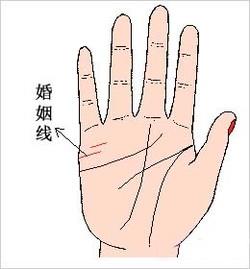 婚姻线又名(爱情线、结合线)在水星丘侧(小指根部掌边),感情线上方,所刻划的短短横线,有时出现几条,但以最长最明显的一条为准,这条线不但表示结婚运,也可以看出恋爱或色情关系,不过,除本线外尚须参考其它部分,决不可因结合线不好,便一口断定结婚运欠佳。要知结婚运必须有健康,金钱,智慧互相配合,同时还得遇到机会,因此务必要参照感情线, 智慧线,生命线三大线条,才能预知结婚或与异性之关系。