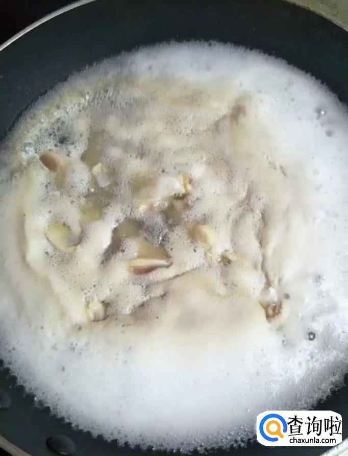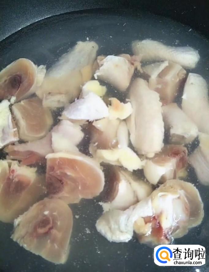 接着我们将剁好的鸡块放入冷水锅中,开大火,煮出血沫,捞出来在凉水里面清洗干净控干水份备用