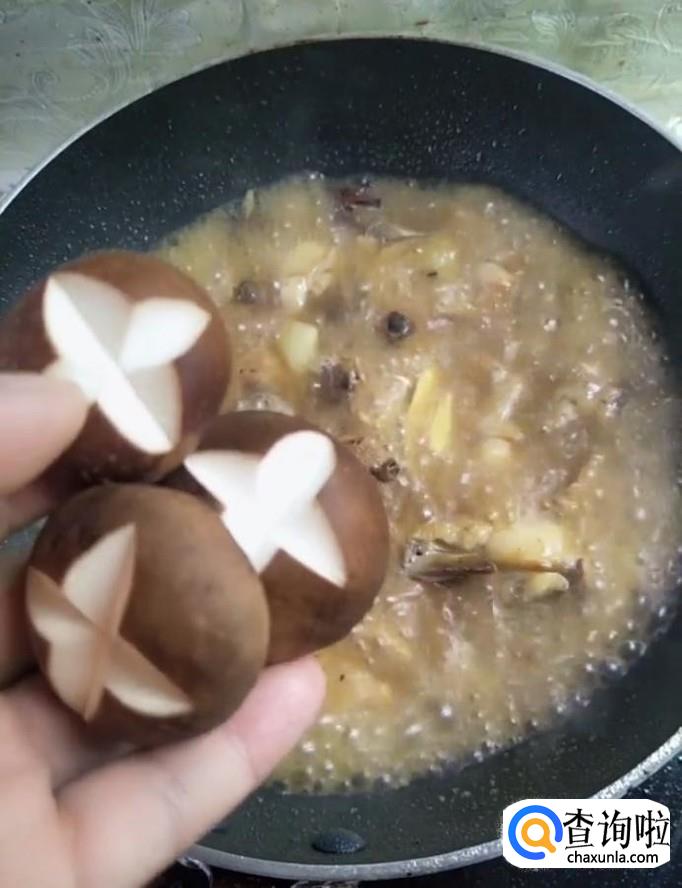 接着我们开大火,把水烧开,放入适量盐,鸡精,白糖,十三香,再把香菇放入锅中,开中火,炖20分钟