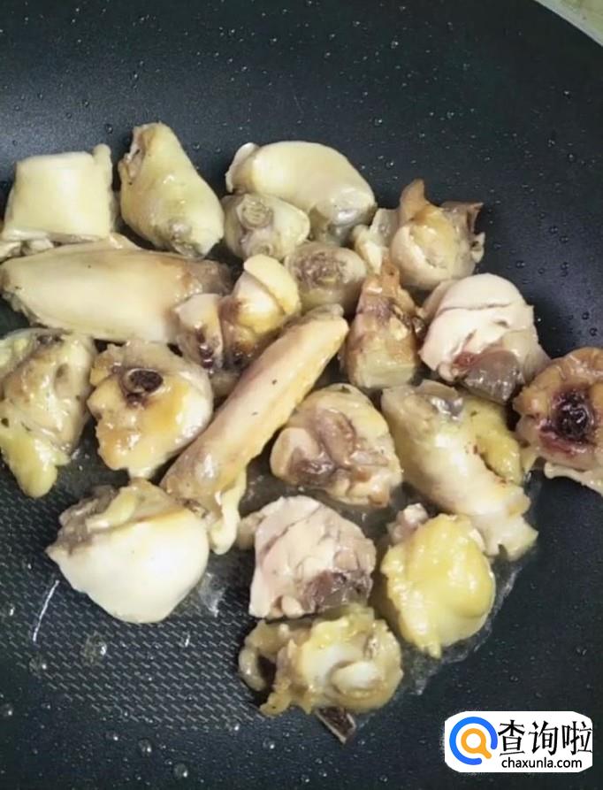 然后我们在锅中放入少许油,油热放入鸡块,煎至两面变色