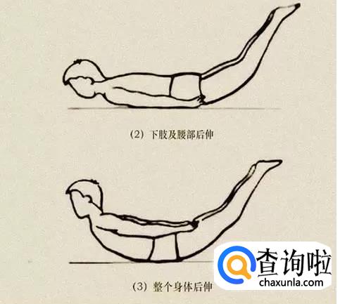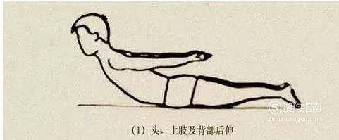 在硬床上,取俯卧位,脸部朝下,双臂以肩关节为支撑点,轻轻抬起,手臂向上的同时轻轻抬头,双肩向后向上收起(肩胛骨收缩)。