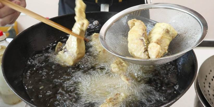 9、最后再将油温烧热到七八成的热度,将鱼块重新放入油锅中炸制,一直炸到金黄酥脆为止捞出控油。