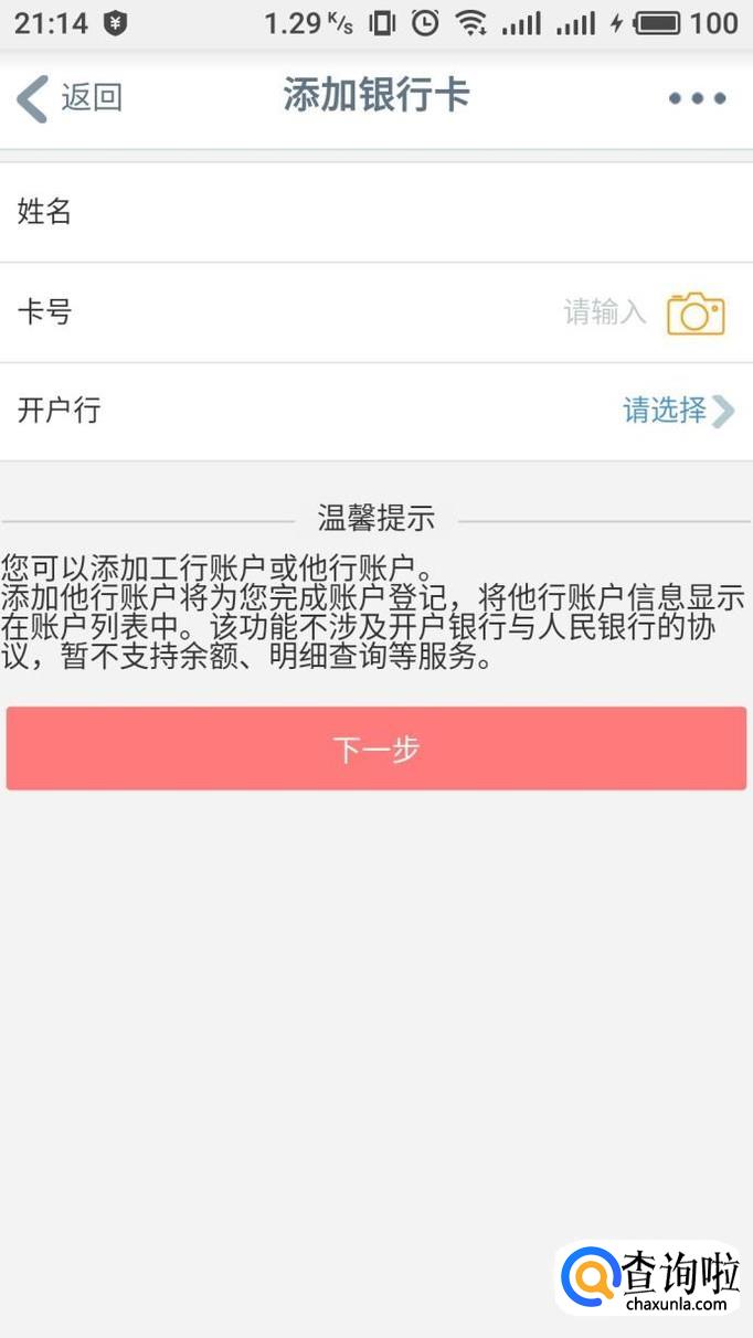 选择开户行之后,输入卡号即可自动判断卡种,点击“下一步”进行绑定即可。