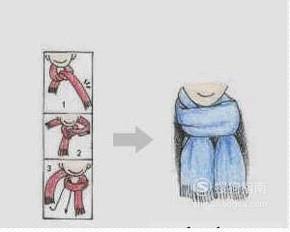 领带结系法:将围巾围上脖子,然后在右段如下图绕上一圈,再将右段从中间穿出,最后将右段插入结中