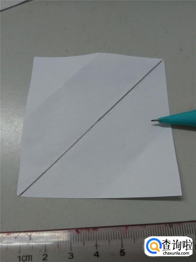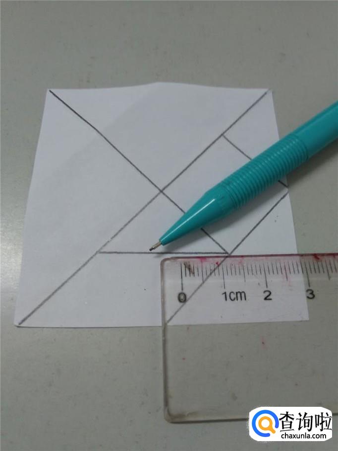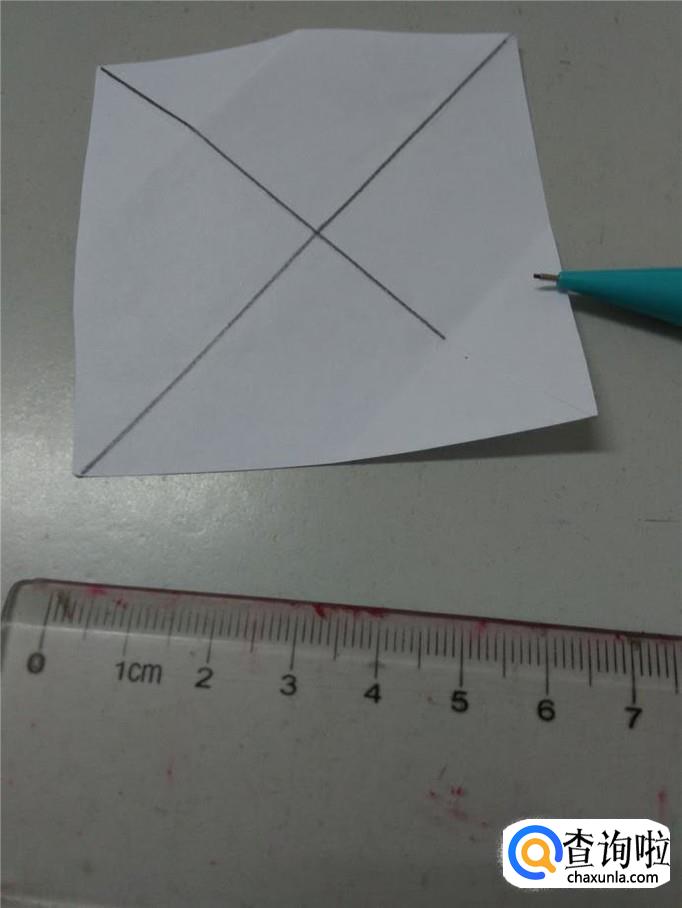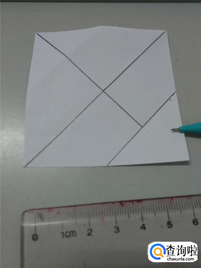 再用笔画另一条对角线,但是不要画到头,留出四分之一的部分不画,如下图。