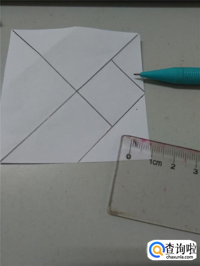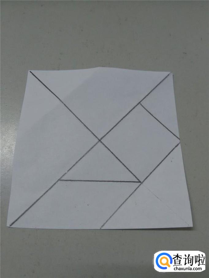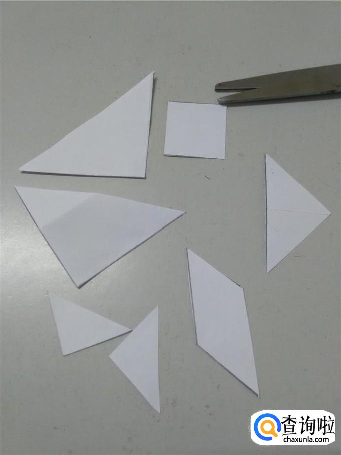 现在,所有的线全画完了,一共把纸分成了七部分,用剪刀沿着画好的线剪开,就得到了纸做的七巧板。