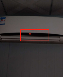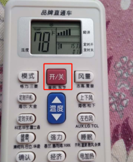 3、然后点击下方遥控器的红色开关按钮。点一下就松开,然后等待遥控器自动匹配适合空调的型号。稍等一会,空调就会有反应,自动开启。