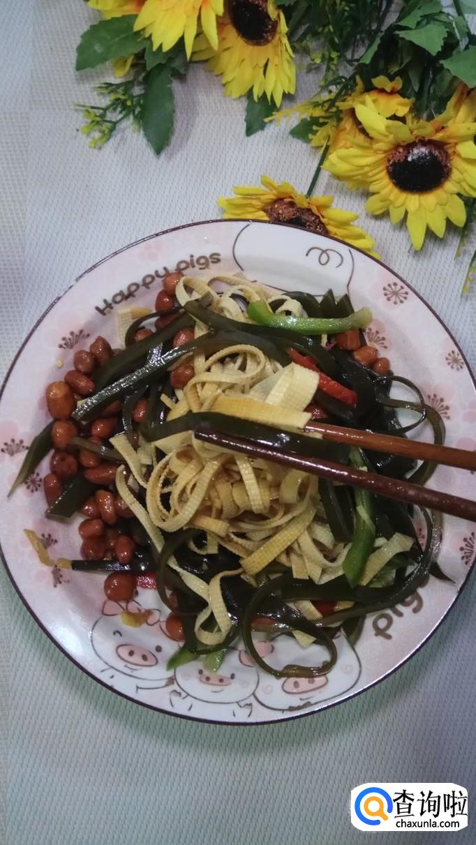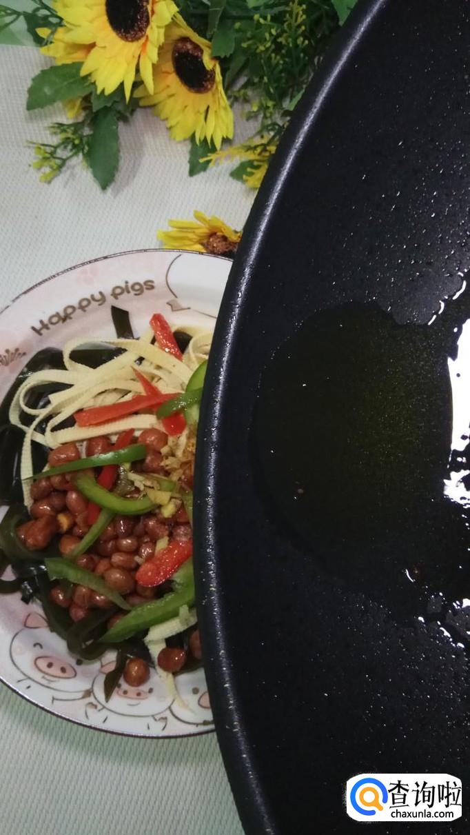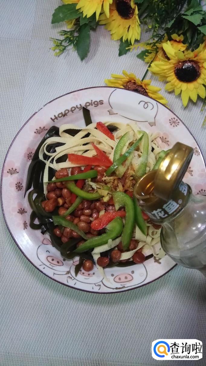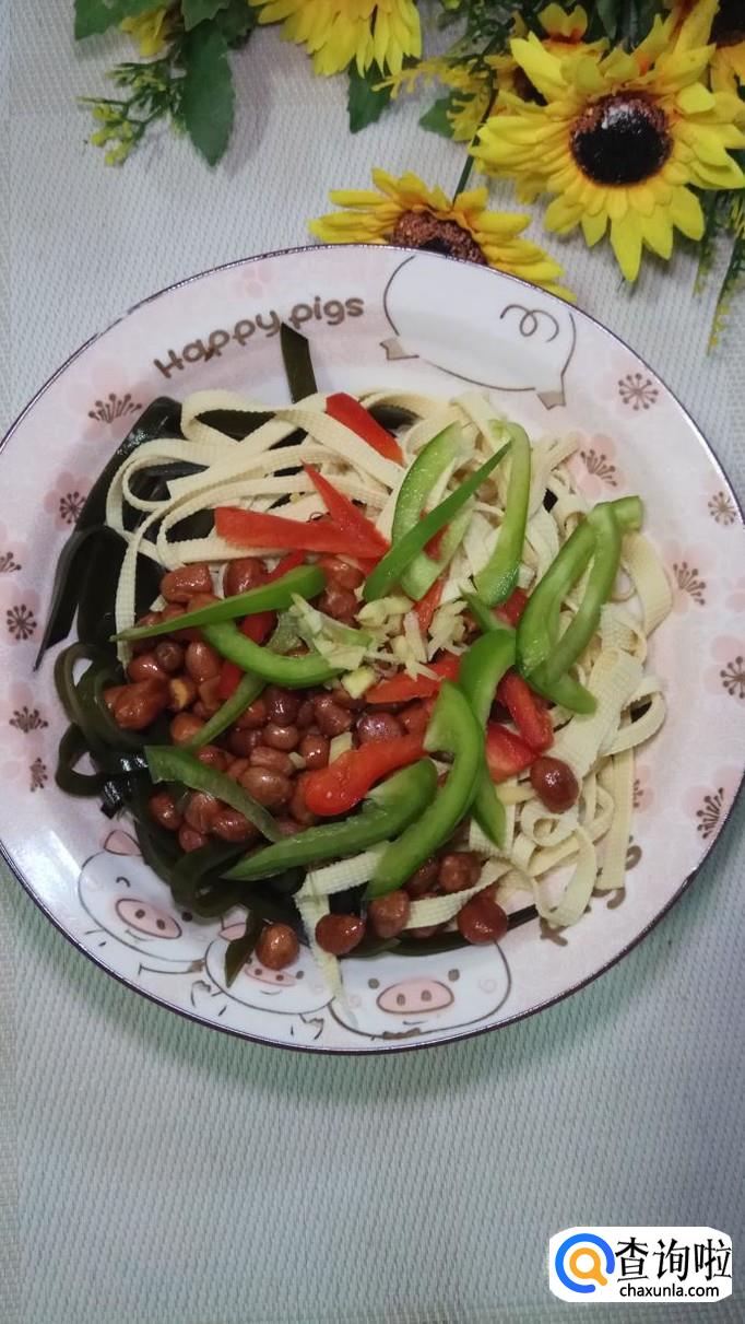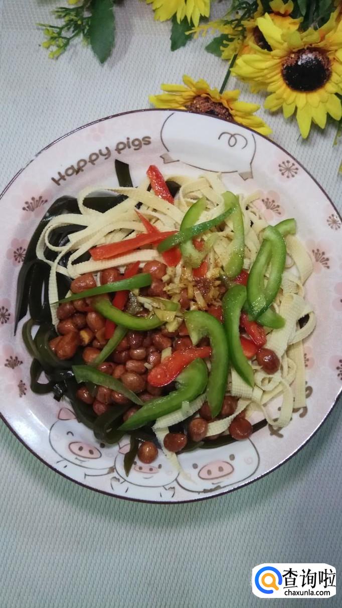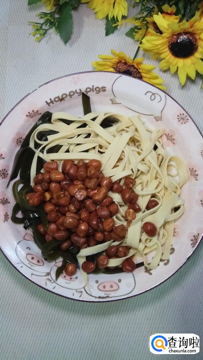 再准备适量炸好的花生米,放入盘中,和海带丝,豆腐皮放在一起。