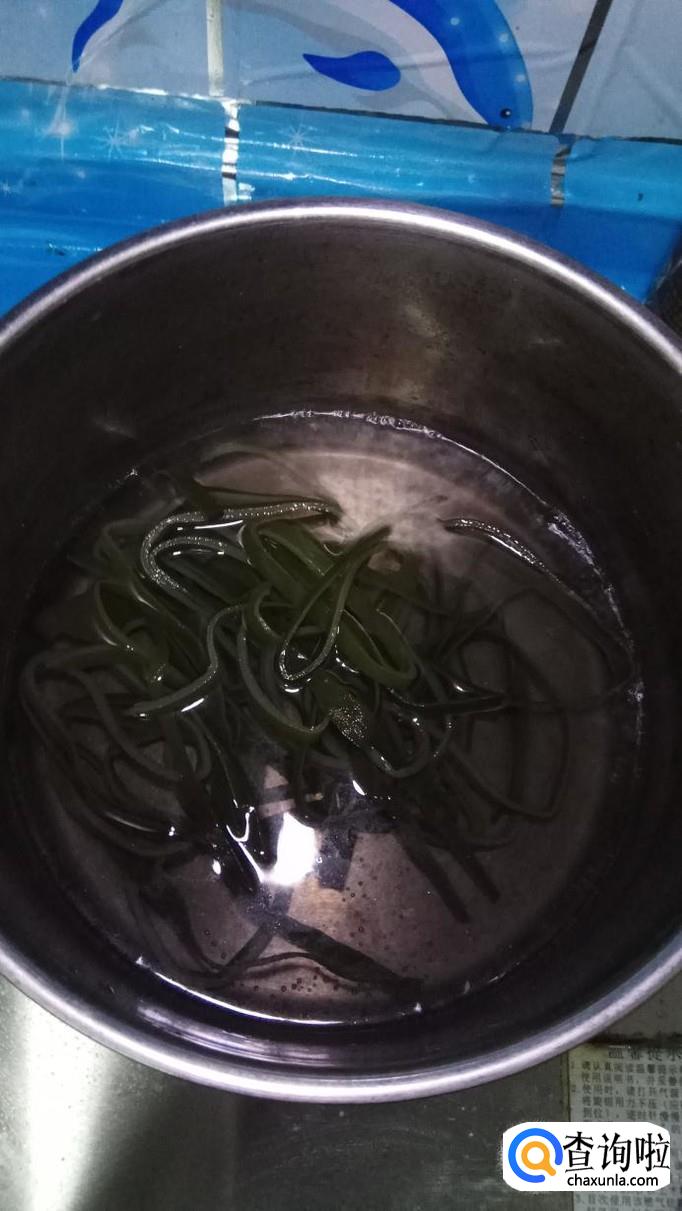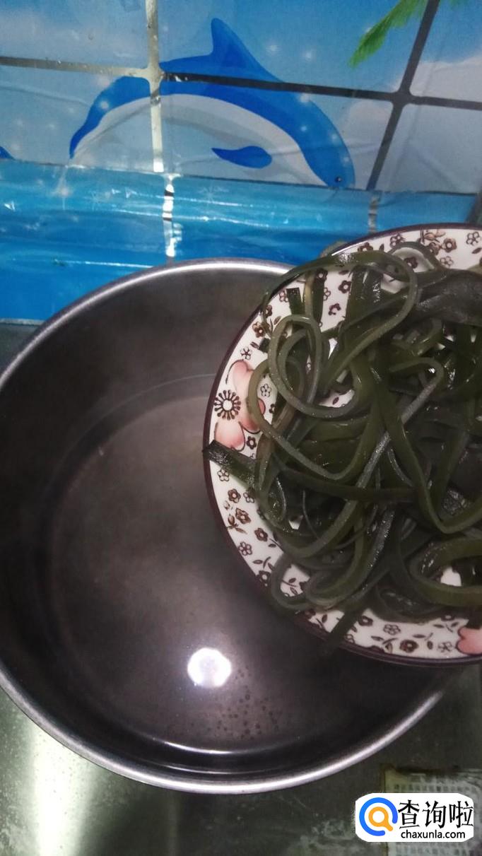 准备适量海带,泡发后,切成丝,放入锅中焯水,泡发海带的时候可以加入少量白醋,这样可以缩短泡发海带的时间。