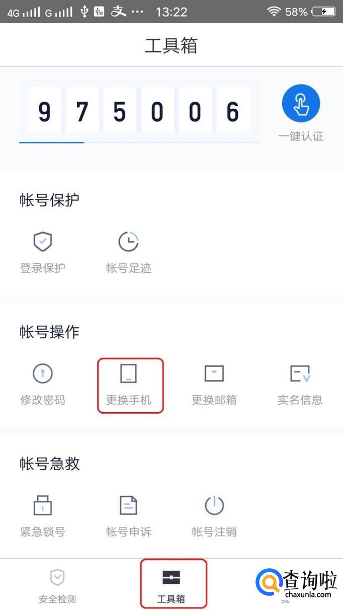 验证之后进入账号管家,点击底部“工具箱”,看到页面内有“更换手机”按钮,点击一下。