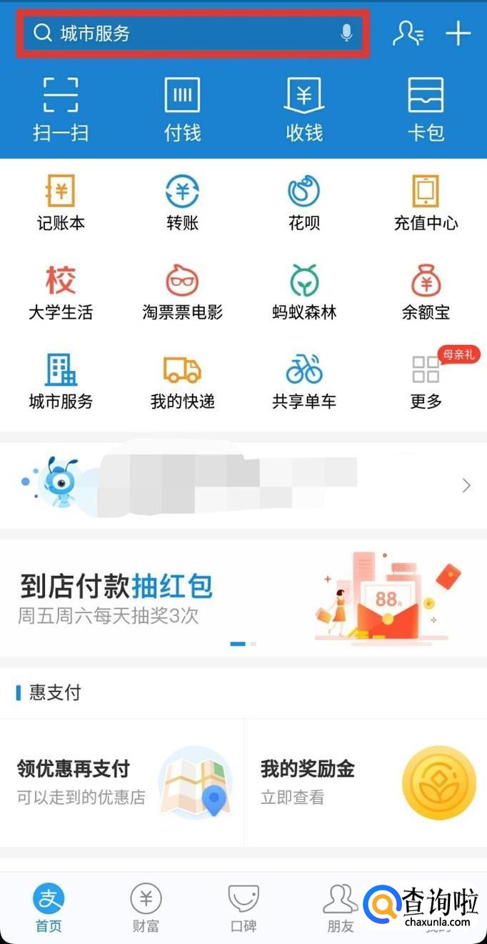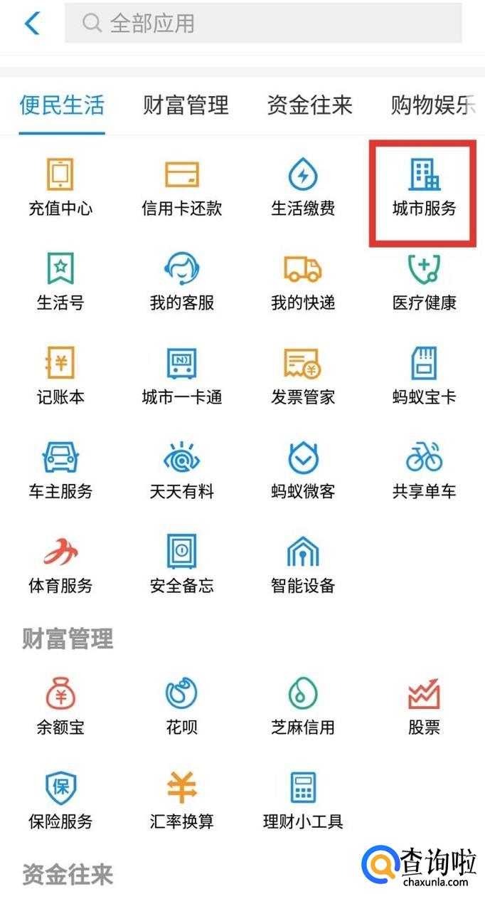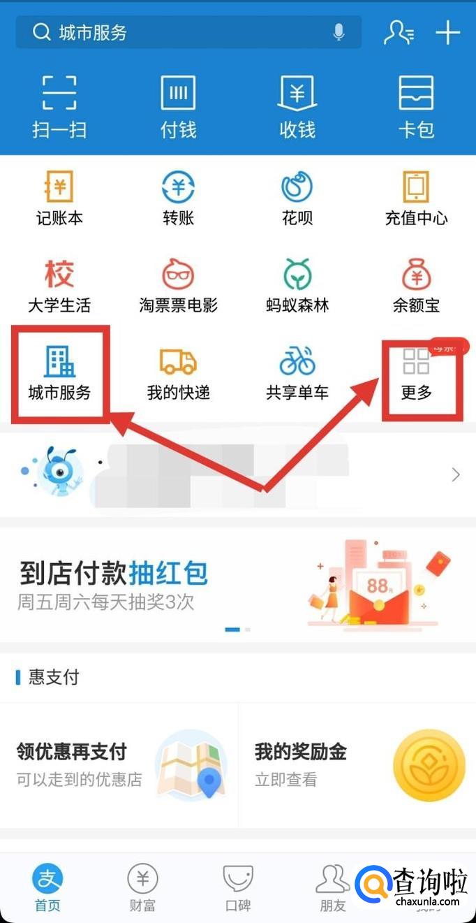 打开支付宝进入到首页之后,如果你的主页有城市服务就可以直接点进去。如果没有,可以在更多里面便民服务中找到城市服务。