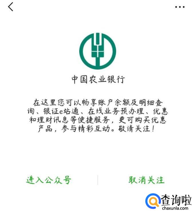 在微信搜索输入“中国农业银行”,查找公众号。公众号确实可以快速有效放心地解决顾客的问题,现下的微信公众号越来越收到消费者的青睐,并不是空穴来风。