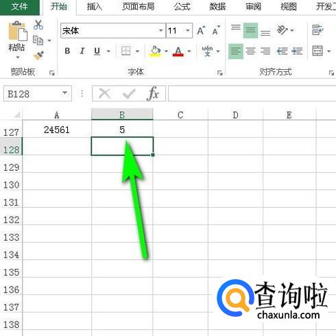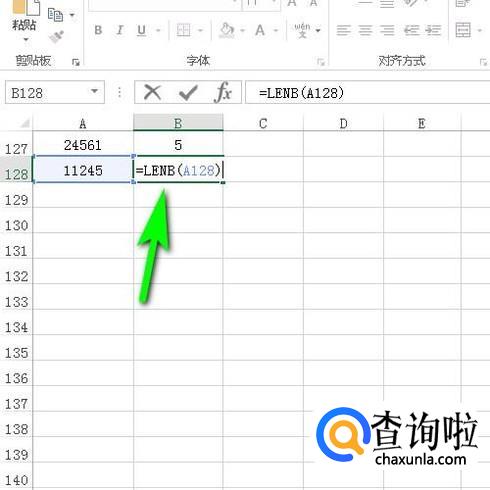在B128中输入公式:=LENB(A128);按下回车键得到字节个数为5