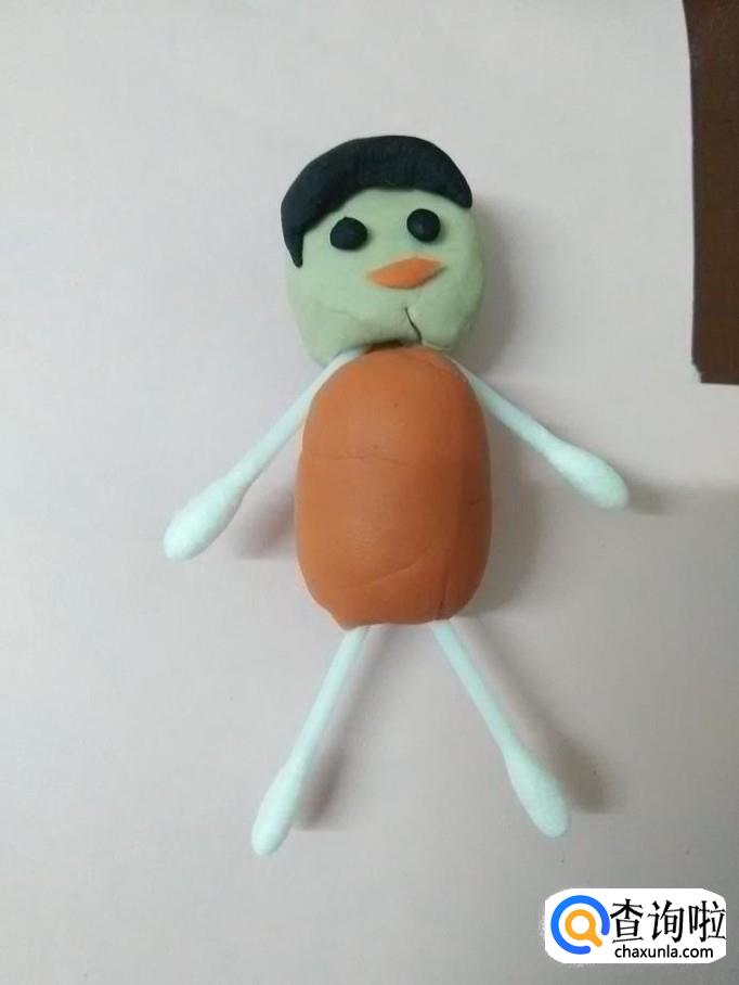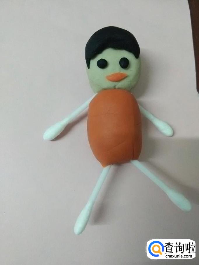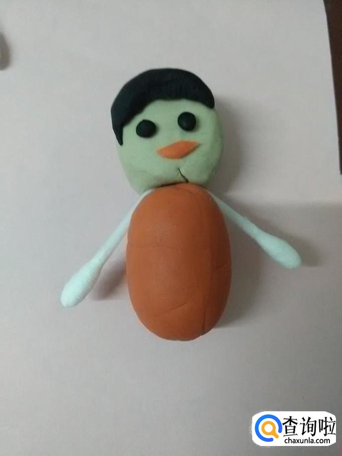 将桔色彩泥团成椭圆形,粘在头下面,当作身体。