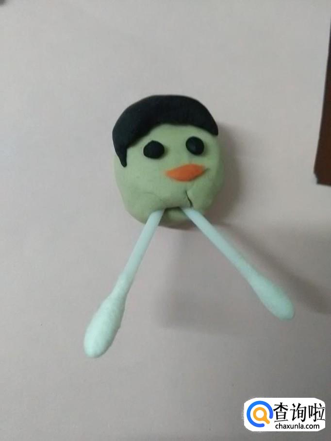 将双头棉签从中间折一下,插入娃娃头部下方,当作两只胳膊。