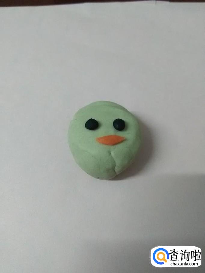 用两块黑色团成小球,粘在娃娃脸上,当作眼睛,用桔色搓一个小条,粘在眼睛下面,当作嘴。