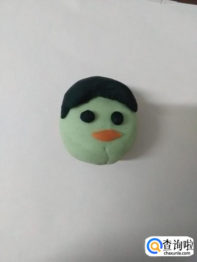 用黑色捏一个半圆形,粘在眼睛上面,当作娃娃的头发。