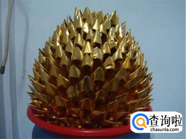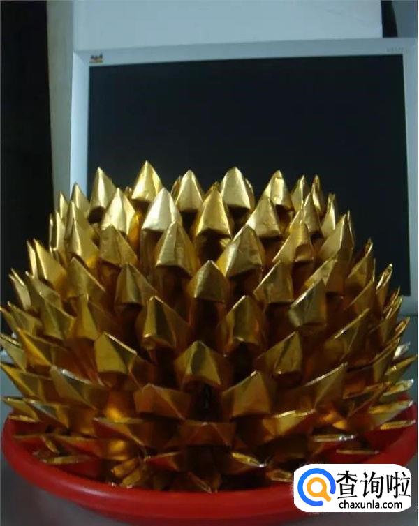 最后就是插纸菠萝的身子了。把每个“小件”的两个孔分别插入两个相邻的“小件”的“脚”上,重复操作,直到把“小件”都插好为止。这样,一个中秋节纸塔就完成了。