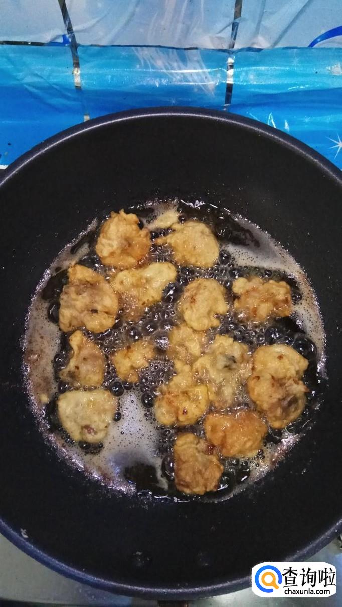 锅中放油,油温五成热,将排骨放入锅中,小火慢炸,注意,火不能大,否则排骨不容易熟透。