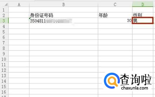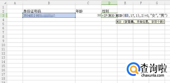 接着在D3单元格输入“=IF(MOD(MID(B3,17,1),2)=0,"女","男")”,如下图所示。