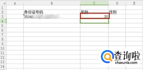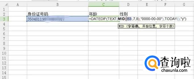 接着在C3单元格输入“=DATEDIF(TEXT(MID(B3,7,8),"0000-00-00"),TODAY(),"y")”,如下图所示。