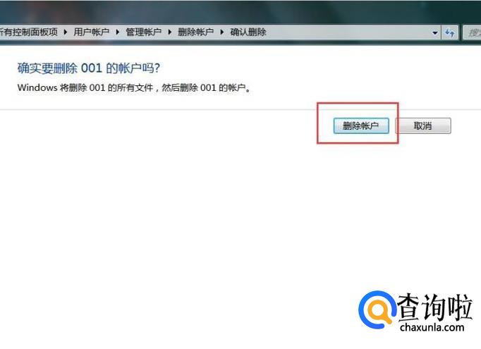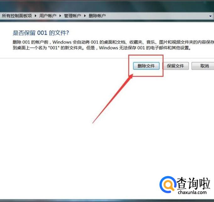 然后我们在确认删除账户对话框中,选择“删除文件”选项,然后点击“删除账户”按钮即可。