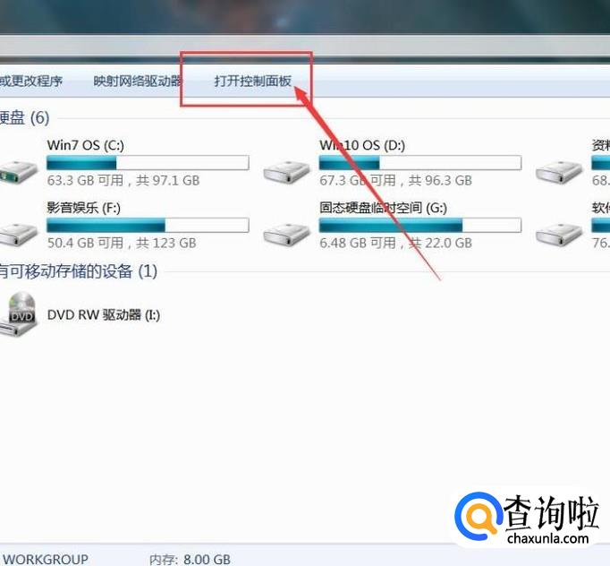 这里以Win7系统为例,打开Win7系统中的计算机界面,在界面中,点击“打开控制面板”选项。