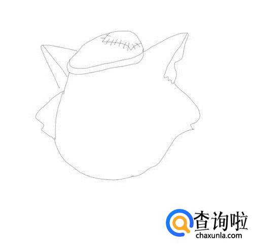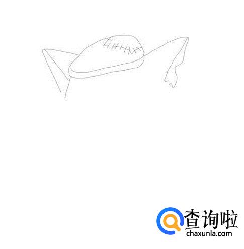 先画出灰太狼的两只耳朵,然后在耳朵之间画出灰太狼的帽子,如图所示: