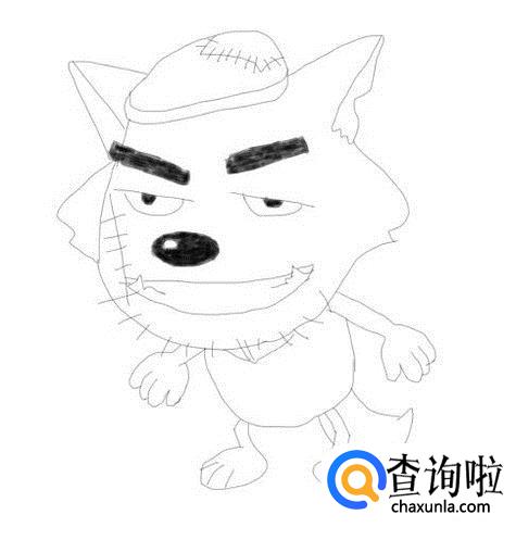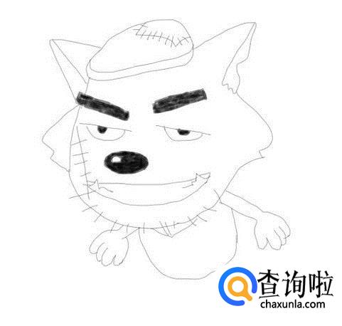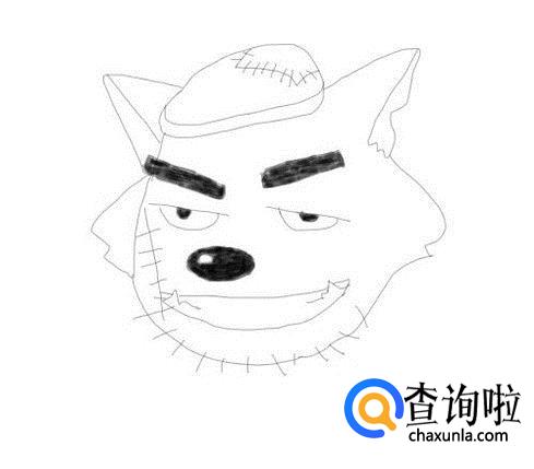再在面部上画出灰太狼的眉毛,并在画出灰太狼的眼睛,鼻子和嘴巴,然后再画出头部上的毛发,如图所示: