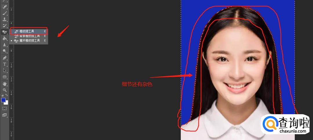 大体的背景颜色换好之后,人物轮廓与背景之间还会存在一点点杂色无法替换,这时候可以使用“橡皮擦”工具进行微调。