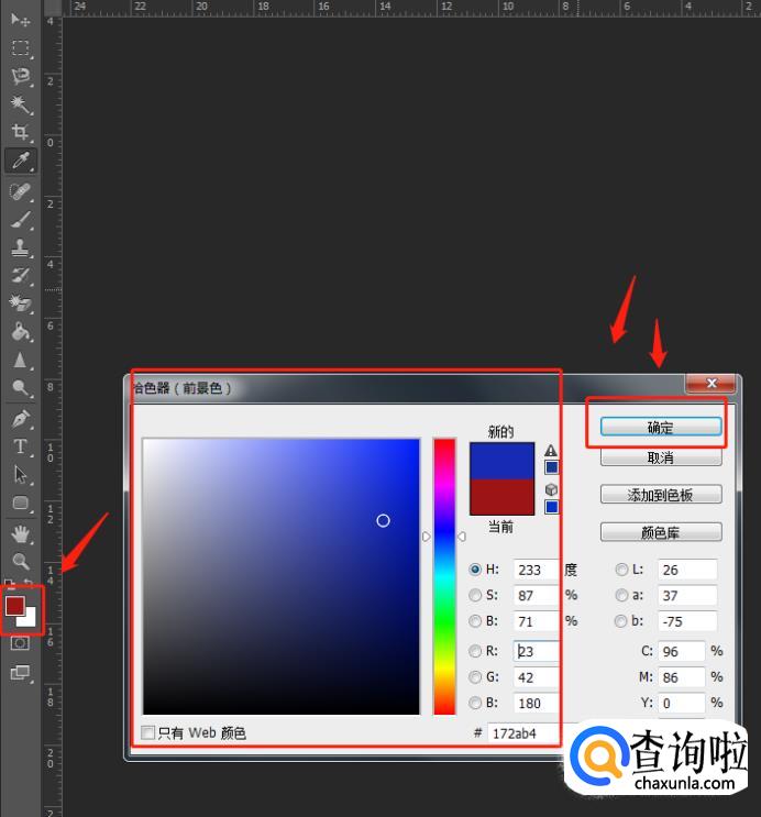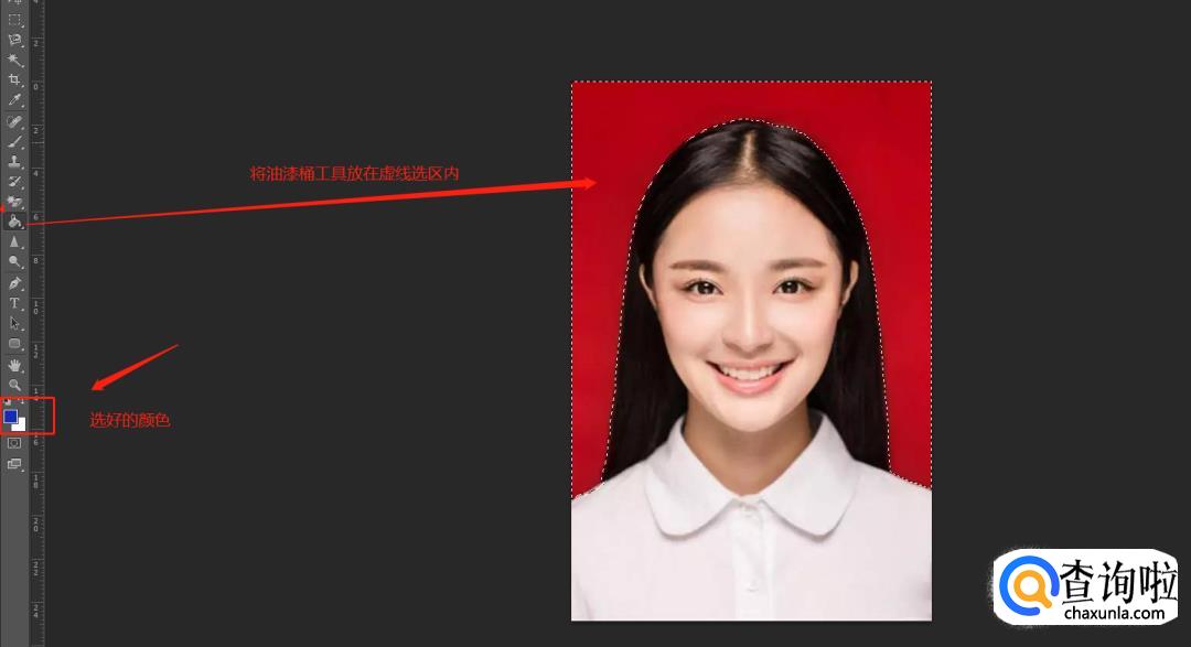 在工具栏中找到“油漆桶工具”,在颜色选区选择想要更换的颜色,点击【确定】,用油漆桶工具点击虚线内选区,即可将背景颜色换成刚刚选好的颜色。