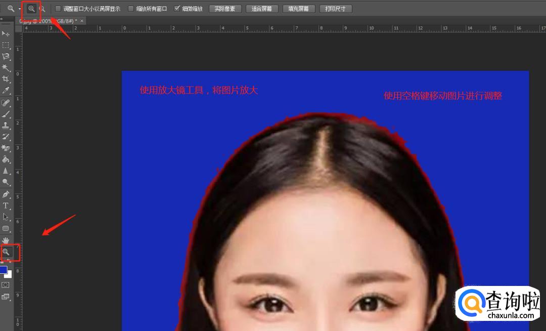 使用‘放大镜’工具,将寸照放大,方便看清没有替换好的颜色的细节,还可以长按空格键,将寸照上下移动,方便修改。