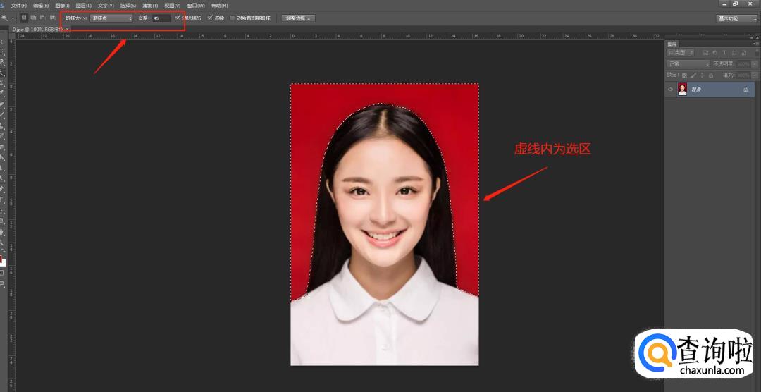 在左侧的工具栏内选择“魔棒”工具。选中整张图片,容差可以设置成40-50之间的参数。先将Shift键按住,再选图片范围,可以增加图片选区。