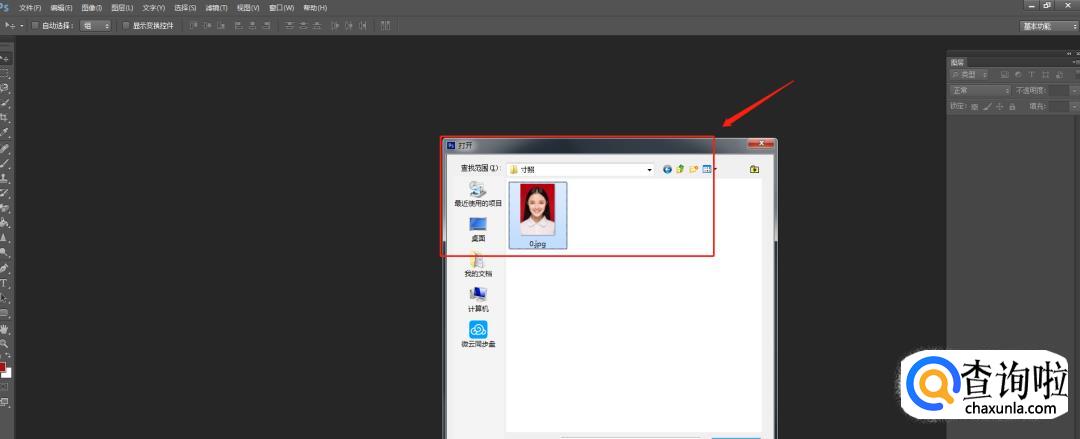 首先,在电脑上下载好PS,在PS内双击界面,打开寸照。