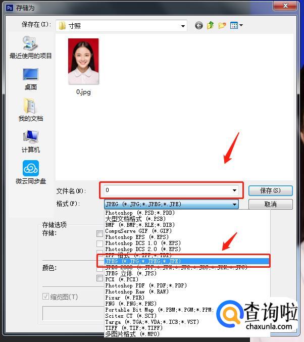 修改完成后,将改好的寸照保存就可以了。点击最上方的【文件】,选择下拉菜单内的“存储为”,选择保存为JPG格式,再命名点击【保存】,就可以了。