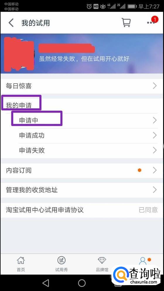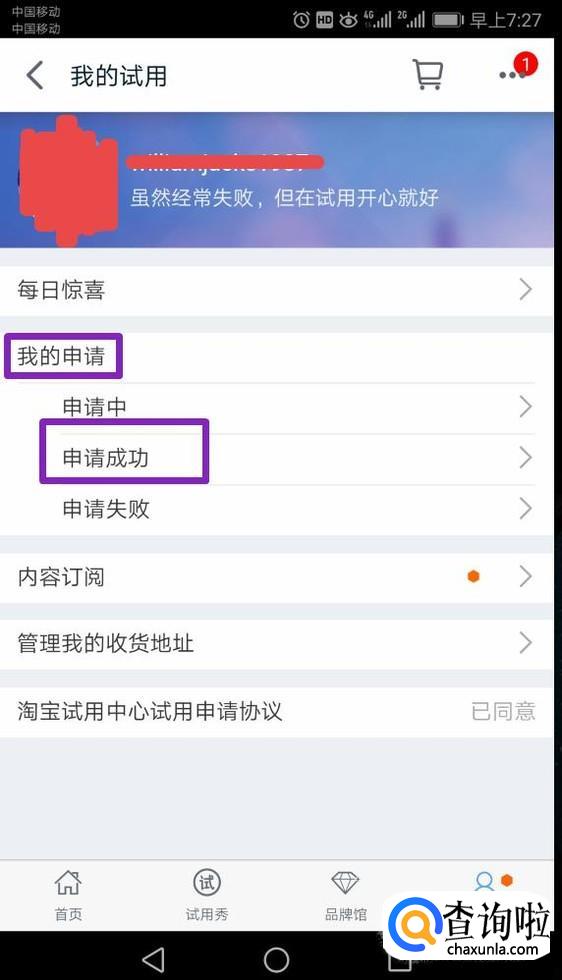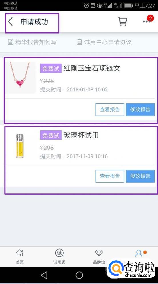 进入后,如果有审核通过的话,我们点击申请领取,之后卖家就会发货了,等我们收到货后,需要填写一份试用报告,如图所示,这是我申请通过,然后领取后,进行了试用报告提交。